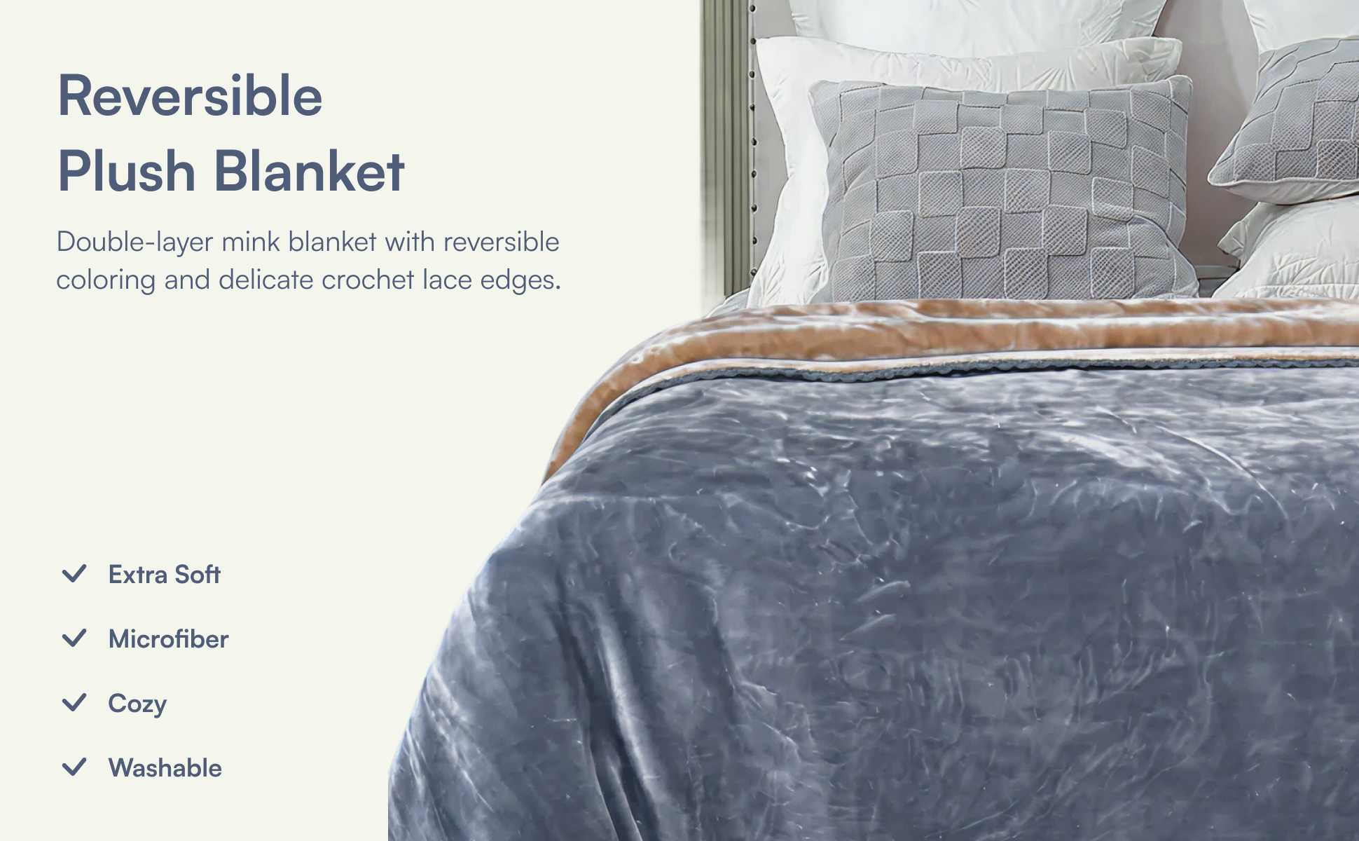 WINTER MINK CLOUDY SILKY - SOFT DOUBLE COLOR HEAVY 2 LAYER BLANKET WITH CROCHET LACE EDGES.